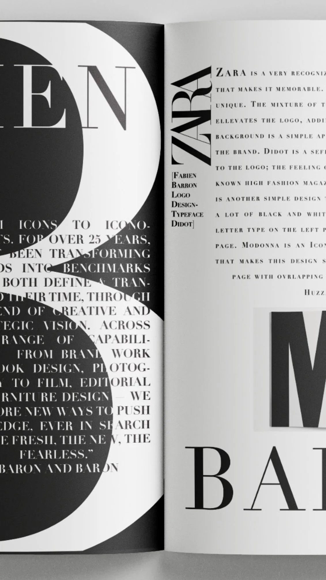 This magazine spread design is inspired by the various designs by Fabien Baron. The black type on a white background is a simple approach and shows the sophistication of the Baron & Baron brand. Didot is a sefif typeface that makes one feel a connection to the Zara logo designed by Baron shown arises the feeling of nostalgia.