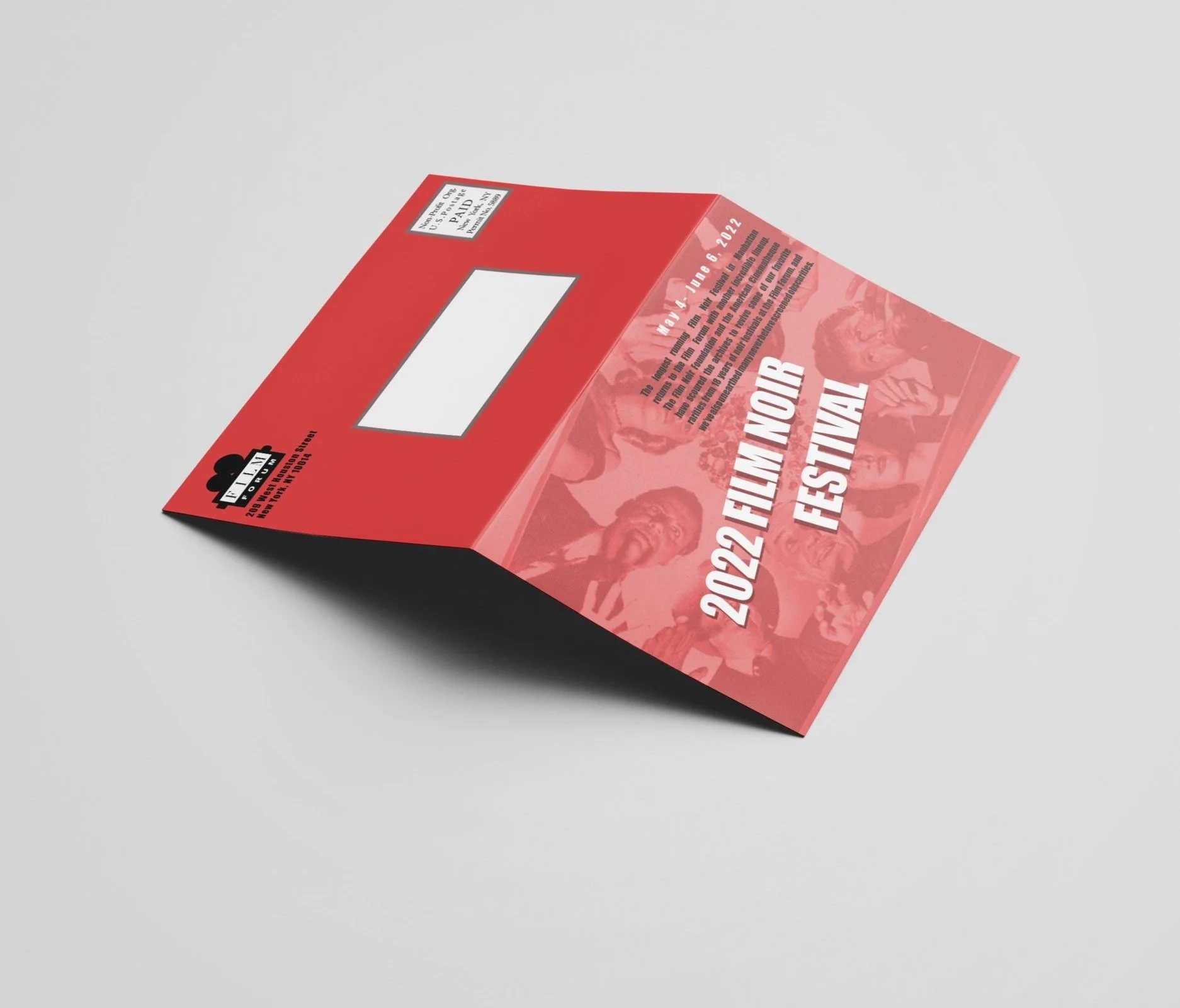 2022 Film noir mailable invitation is a project that shows skill in print design and duotone color. The mailable is shown front and back with folds and mailing section, de- signing for the longest running film noir festival. The mailable invitation is inspired by the ending credits to a movie. Using duotone color schemes makes for more unique contrast with tints, shades, and size. The transparent background images as well as the layered images makes for contrasted dimension. The logo deign is an interpretive film camera that highlights the brand name is an eye-catching array of cohesive, contrasting typography.